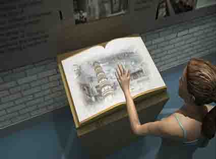 虛擬電子書猶如一本打開的書籍,里面記載的豐富資料可通過參觀者揮動手臂“翻閱”書籍,如同平常翻閱書籍,快速找到您想翻閱的內(nèi)容。